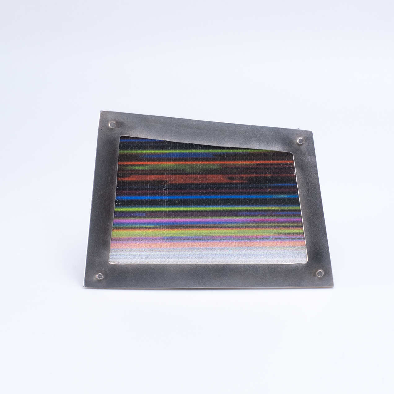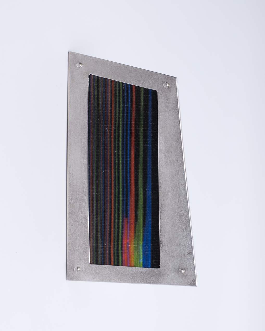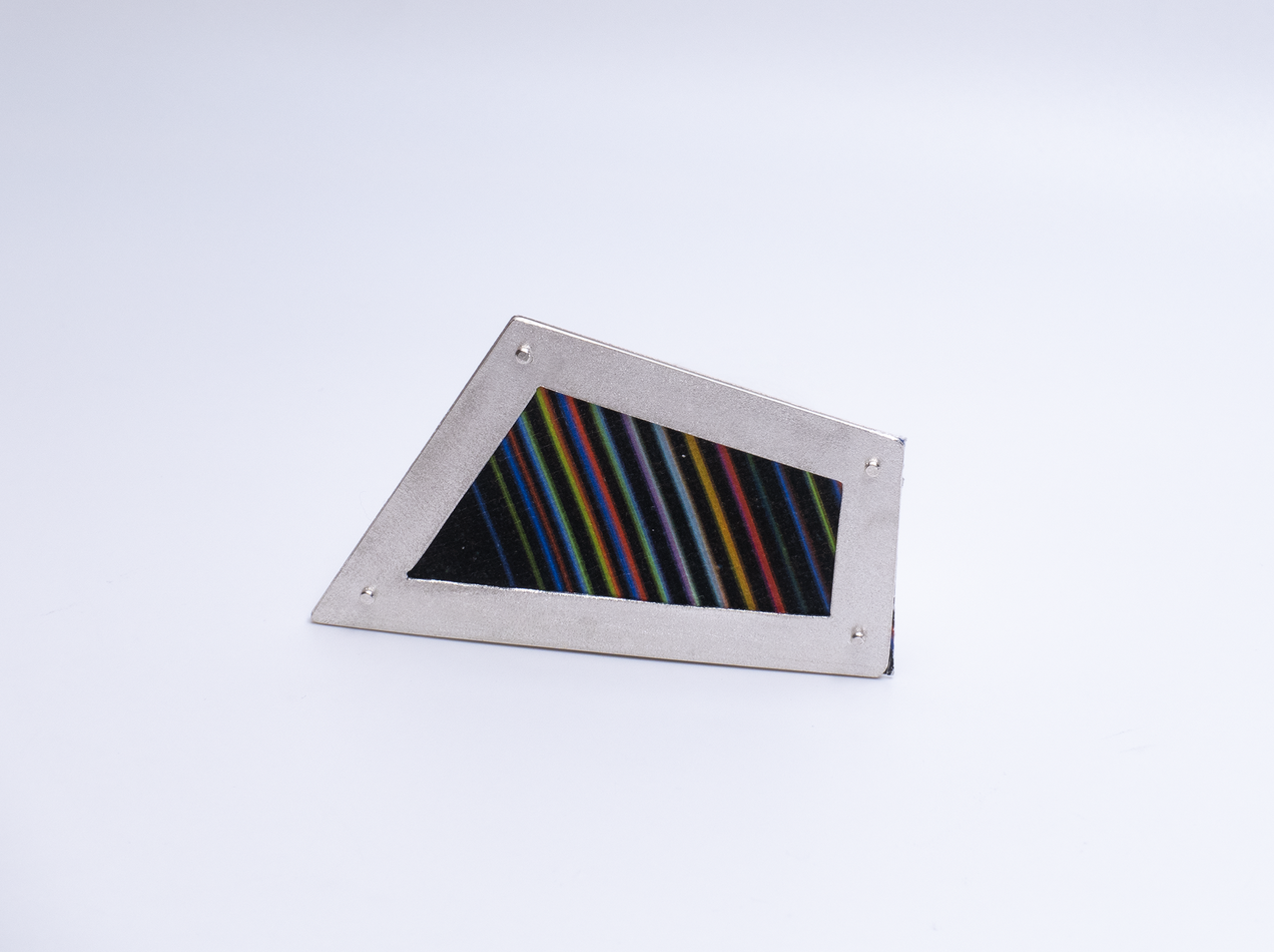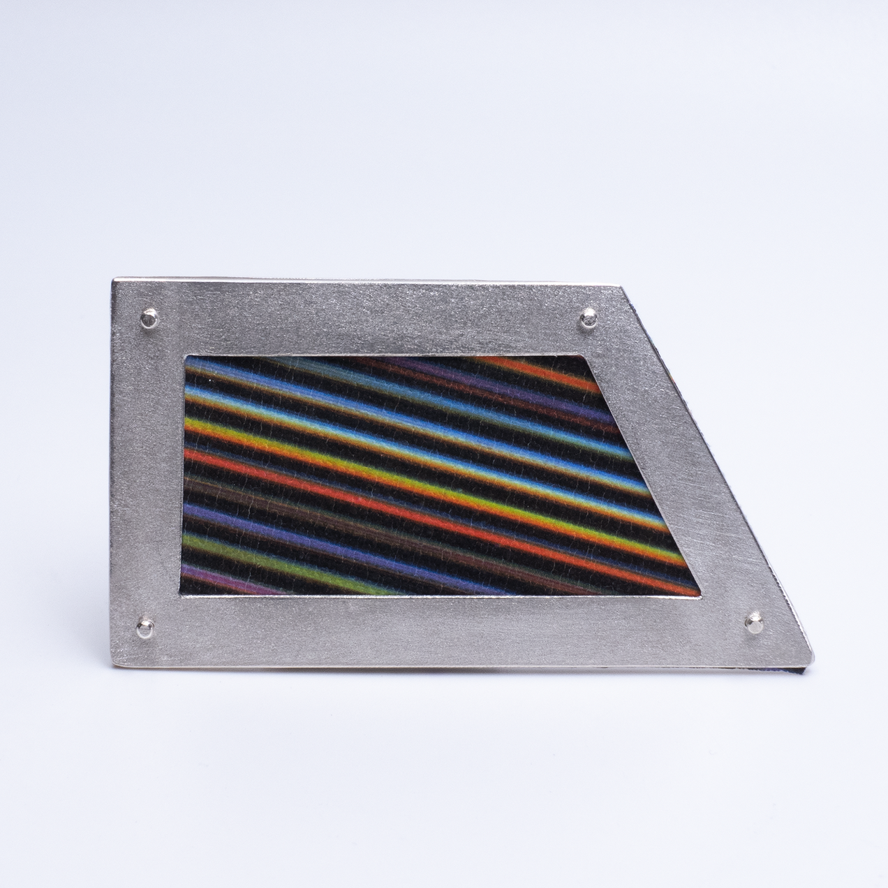 The canvas sections provided by Mladen Bizumic are samples of his large-format photo prints, which depict reflections of scanned mirror pieces as a prismatic color gradient. Ela Nord placed the result of this play of light and backlight in a matt silver frame so that the resulting brooches look like abstract paintings.