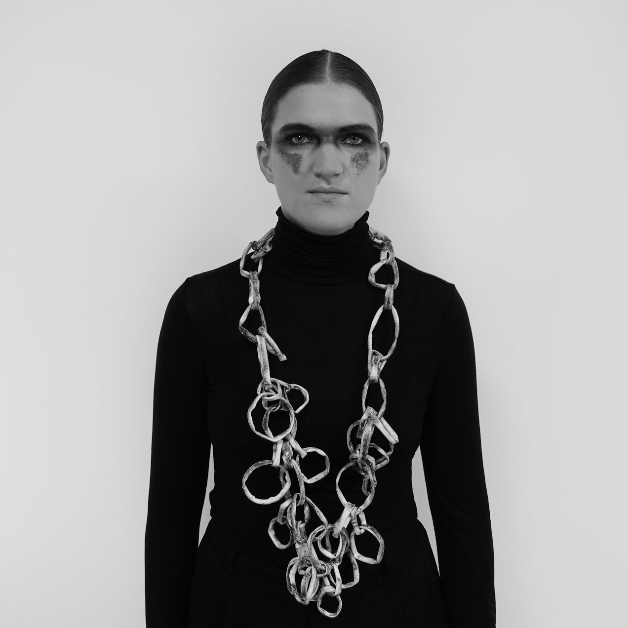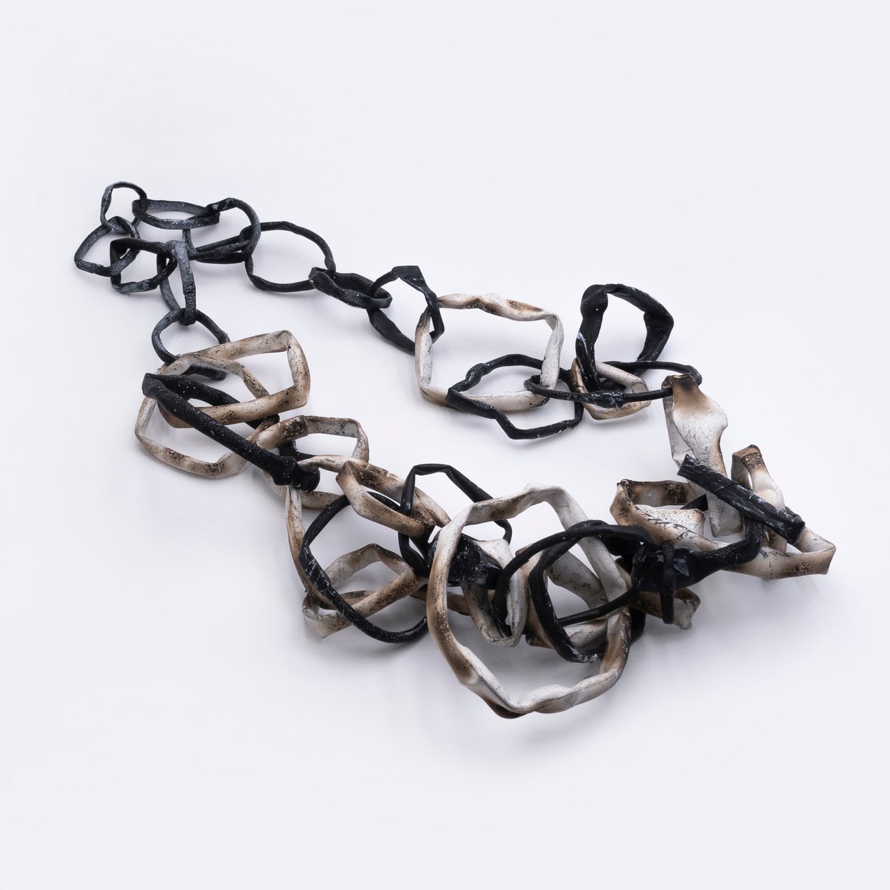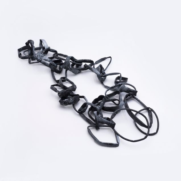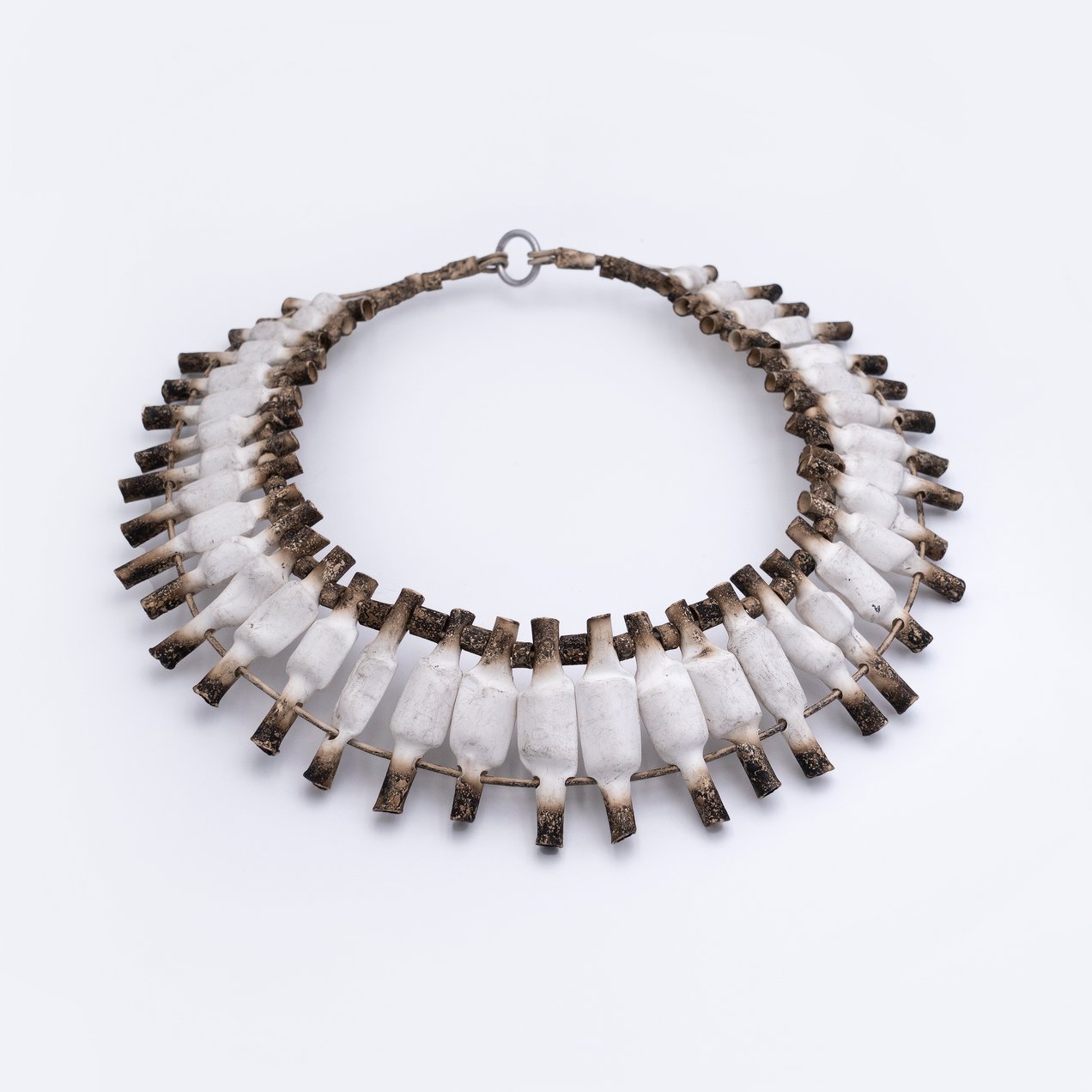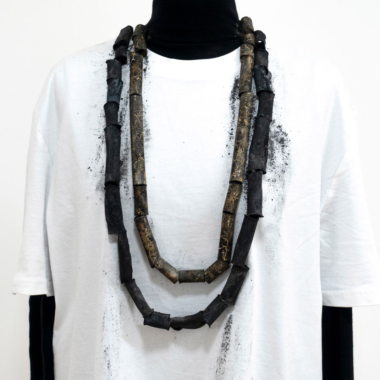 A step-by-step burning process is used for the wearable form of the necklaces, and the ash is removed in several intermediate steps until finally the material is stabilized and thus brought into a comfortable form.