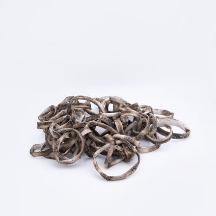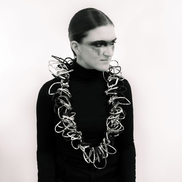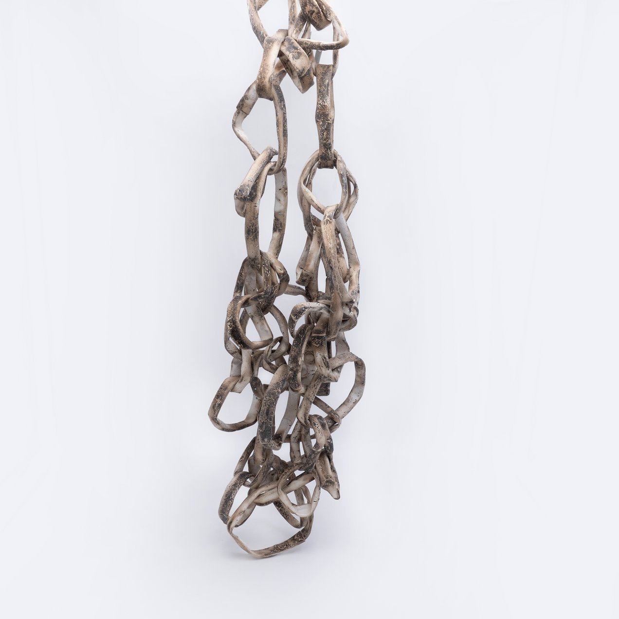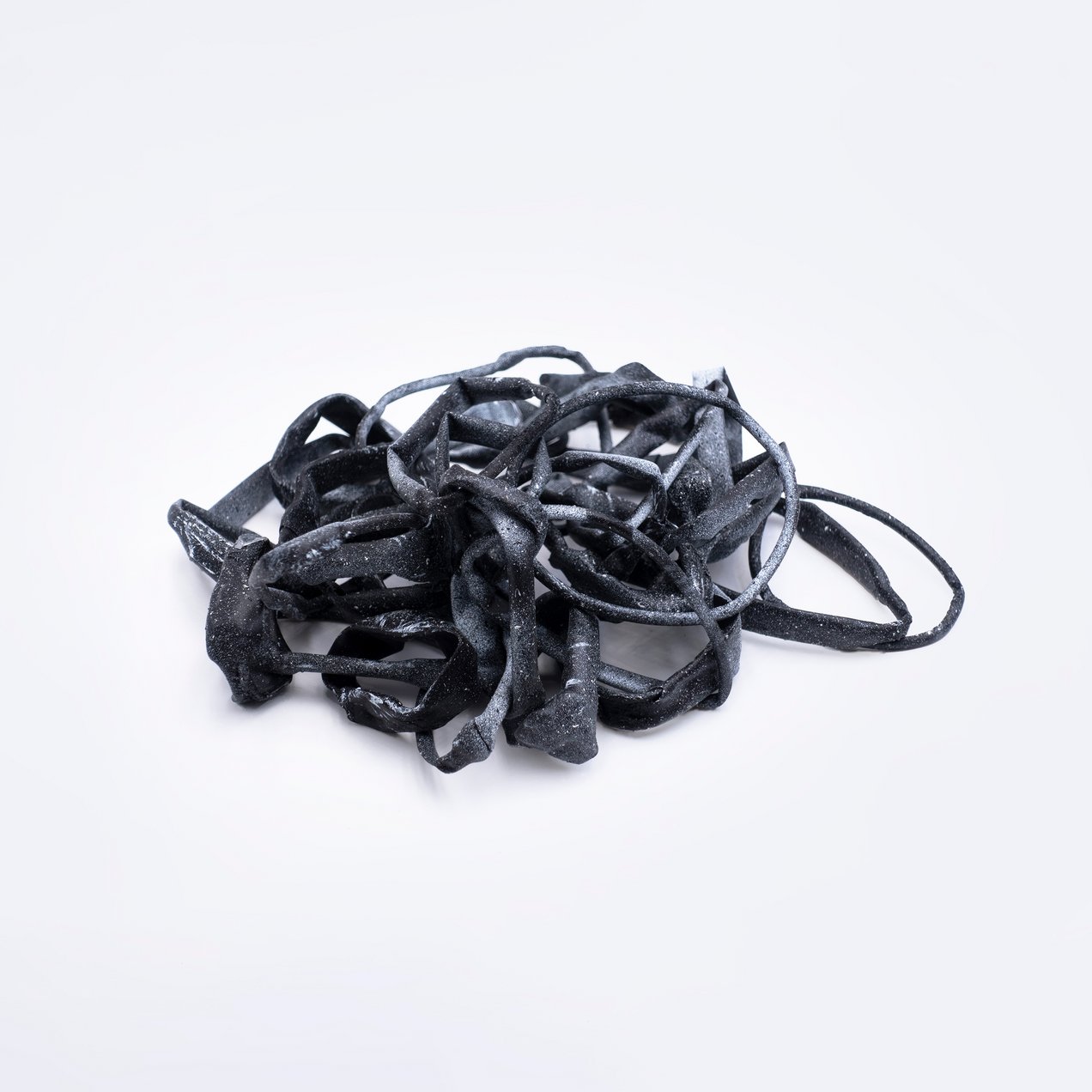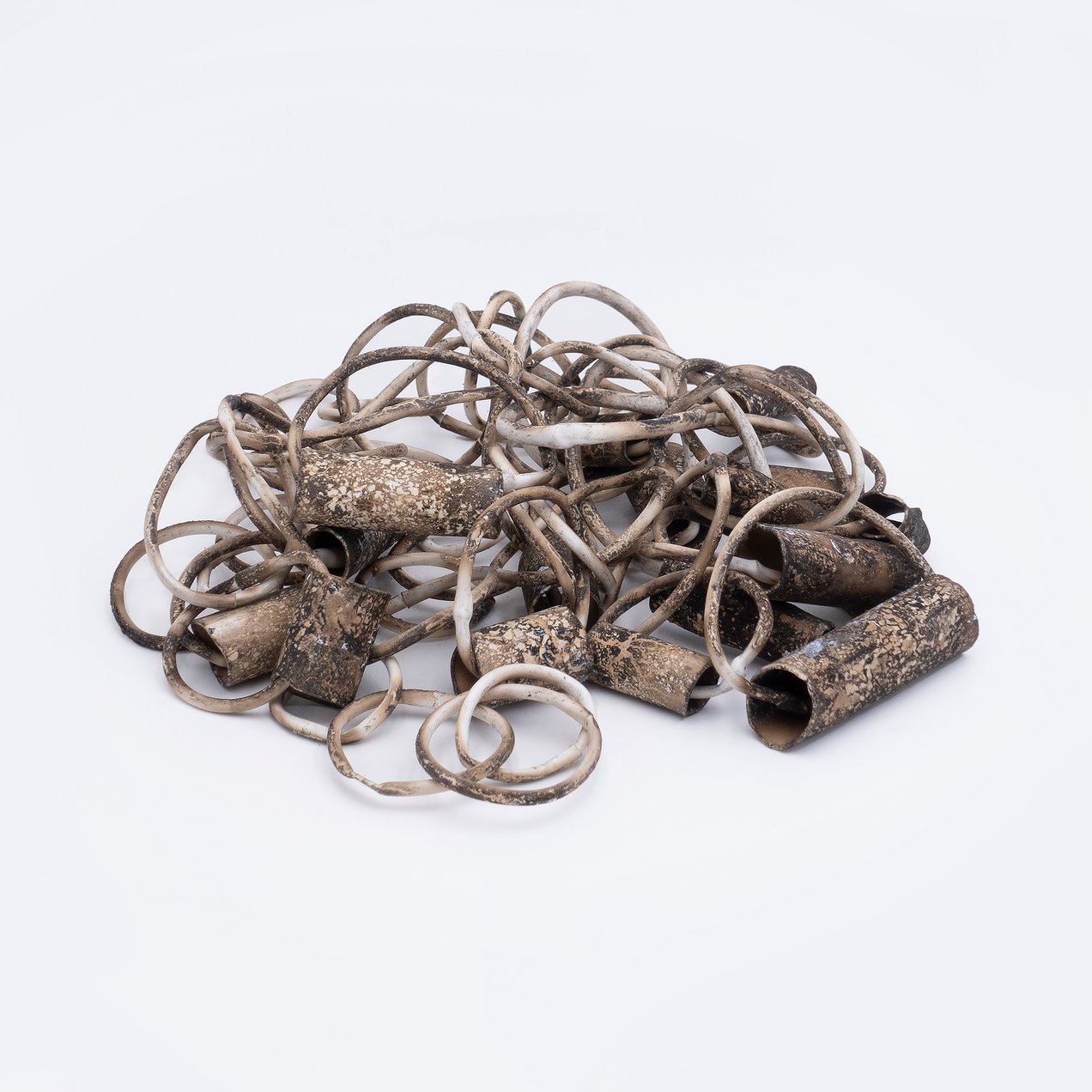 A step-by-step burning process is used for the wearable form of the necklaces, and the ash is removed in several intermediate steps until finally the material is stabilized and thus brought into a comfortable form.